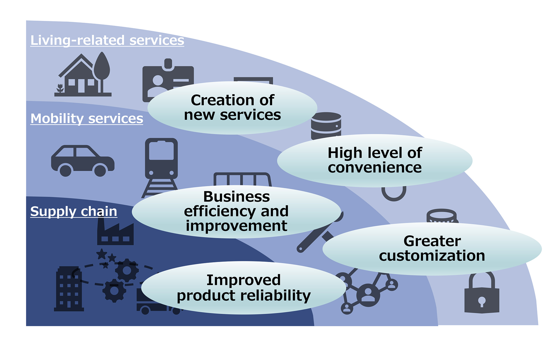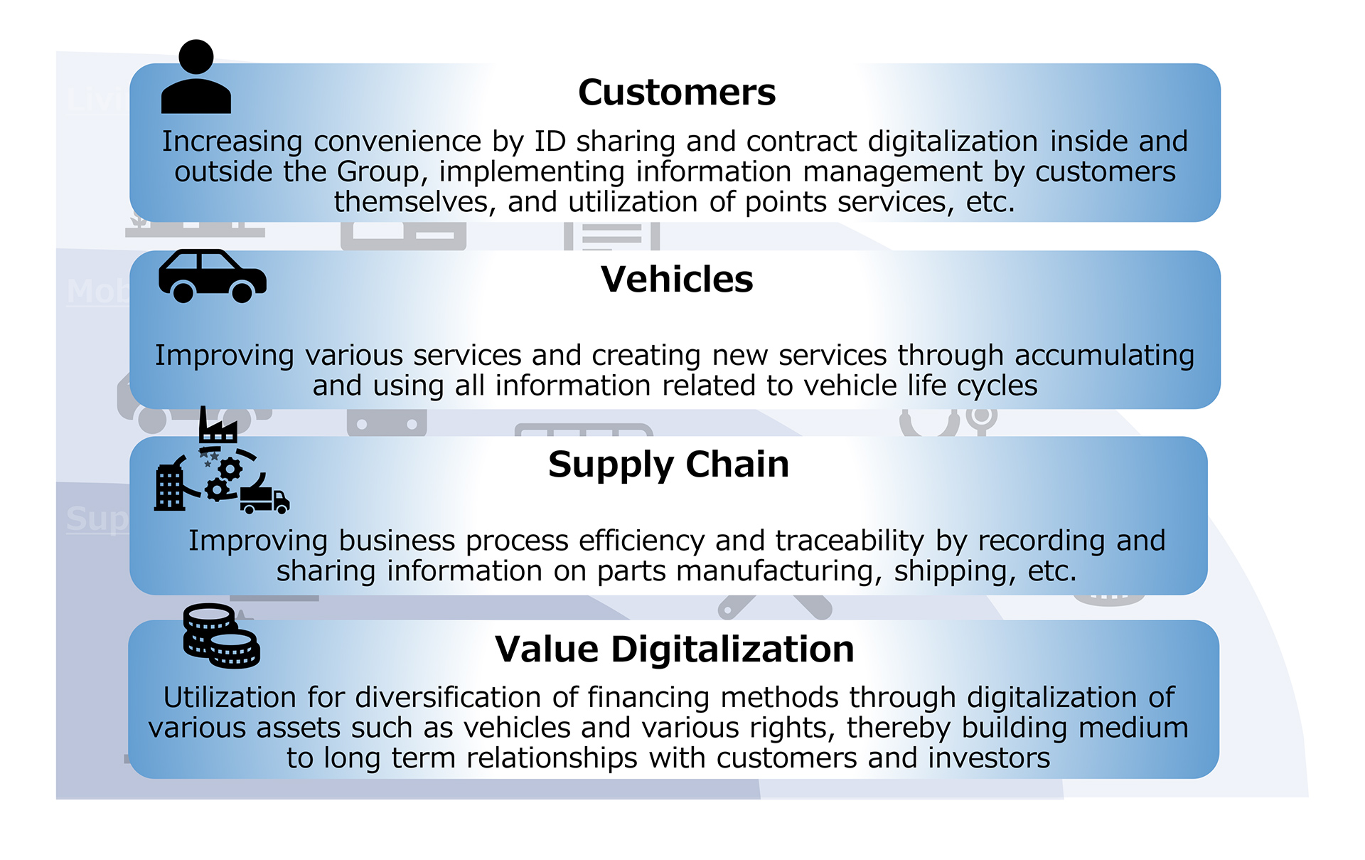 Dans un communiqué de mars 2020, Toyota a annoncé étendre son initiative blockchain dans le cadre de sa stratégie axée sur la Mobilité. Le groupe veut offrir un large choix de services liés aux transports, ce qui implique de « se faire des amis » à la fois au sein du groupe et en dehors. La blockchain est une des technologies utilisées pour construire un tel écosystème de façon sécuritaire, à la fois pour les partenaires et les clients.