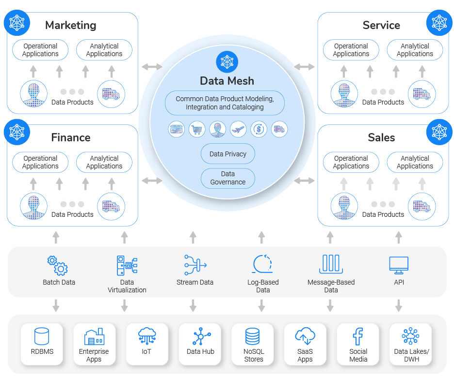 Le Data Mesh ou « maillage de données » n’est pas une technologie mais un cadre de travail pour permettre aux entreprises de mettre la donnée au centre de leur organisation. Avec une approche de décentralisation plutôt que l’approche classique de centralisation des données dans un lac de données (Data Lake) ou entrepôt de données (Data Warehouse). L’idée est plutôt de favoriser la collaboration entre les domaines de l’entreprise, casser les silos de données, en donnant aux « métiers » la responsabilité des données analytiques.